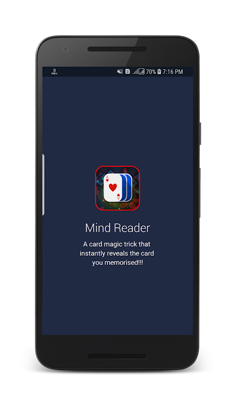Mindreader is in feite mindtracker en magische mindreader.Een stel speelkaarten uit het kaartspel wordt aan je getoond. Je moet een kaart in gedachten kiezen, want het kaartspel wordt snel door de kaart voor je heen geramd. In een oogwenk onthult deze app de kaart in je geest als magie! Met deze truc in je telefoon kun je op elk feest een giller zijn. Het is pure illusie en je kunt de truc onderscheiden nadat je het een paar keer hebt gebruikt. Maar dit is een geweldige app als je indruk wilt maken op je vrienden.