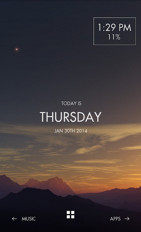 This minimal theme is set against a beautiful mountain background during a sunrise. The main page presents you with the day, time, and your battery percentage. A swipe to the right reveals your music screen, which displays album art and music info. Swiping left reveals the apps screen which lets you quickly access camera, email, phone, web, and more.
