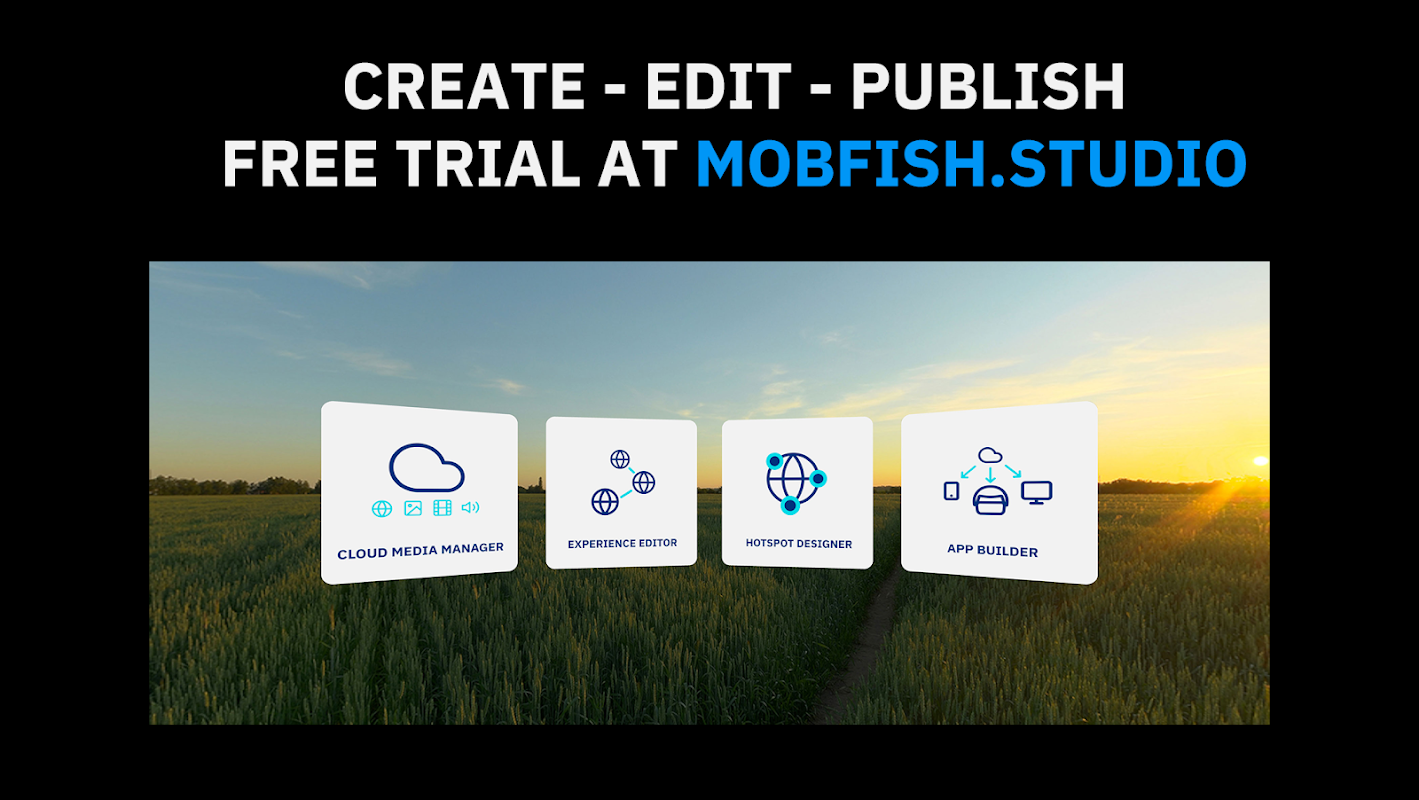 Registreer je bij mobfish.studio om gratis toegang te krijgen tot de VR STUDIO Editor. Met de browsergebaseerde cloud-applicatie kun je klanten, kijkers en collega's inspireren met zelfgemaakte virtuele applicaties.