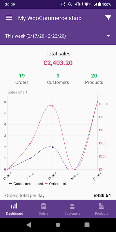 Met Mobile Assistant for WooCommerce aan bent u onderweg en heeft u toegang tot de realtime winkelgegevensrapporten binnen handbereik. Hiermee kunt u de belangrijkste details van uw producten, klanten en bestellingen volgen vanaf uw Android-apparaat, waar u ook bent.