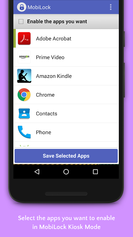 MobiLock lets you turn your Android smartphones or tablets into kiosk mode by locking down the default home screen. Kiosk mode allows the user of the phone/tablet to ONLY access apps that you have allowed. You can easily block access to Games, Browsing, installation of other apps, System settings and more. You are provided with a default password to change settings or ‘Exit’ the kiosk mode.