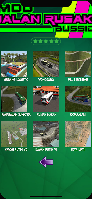 Daarnaast zijn er kaarten van boswegen, mijnbouwwegen, palmolieplantages en lange tolwegen die gebruikt kunnen worden met verschillende voertuigen, waaronder bussen, vrachtwagens en pick-uptrucks. Deze mod ondersteunt de Bus Simulator Indonesia-update, met realistische graphics en wiebelende ophangingseffecten.