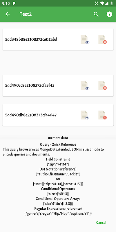 Met deze applicatie kunt u uw MongoDB-client hebben, kunt u verbindingen tot stand brengen, collecties toevoegen en verwijderen, documenten toevoegen, bewerken, verwijderen en bekijken vanuit de collectie, allemaal in de palm van uw hand op uw smartphone