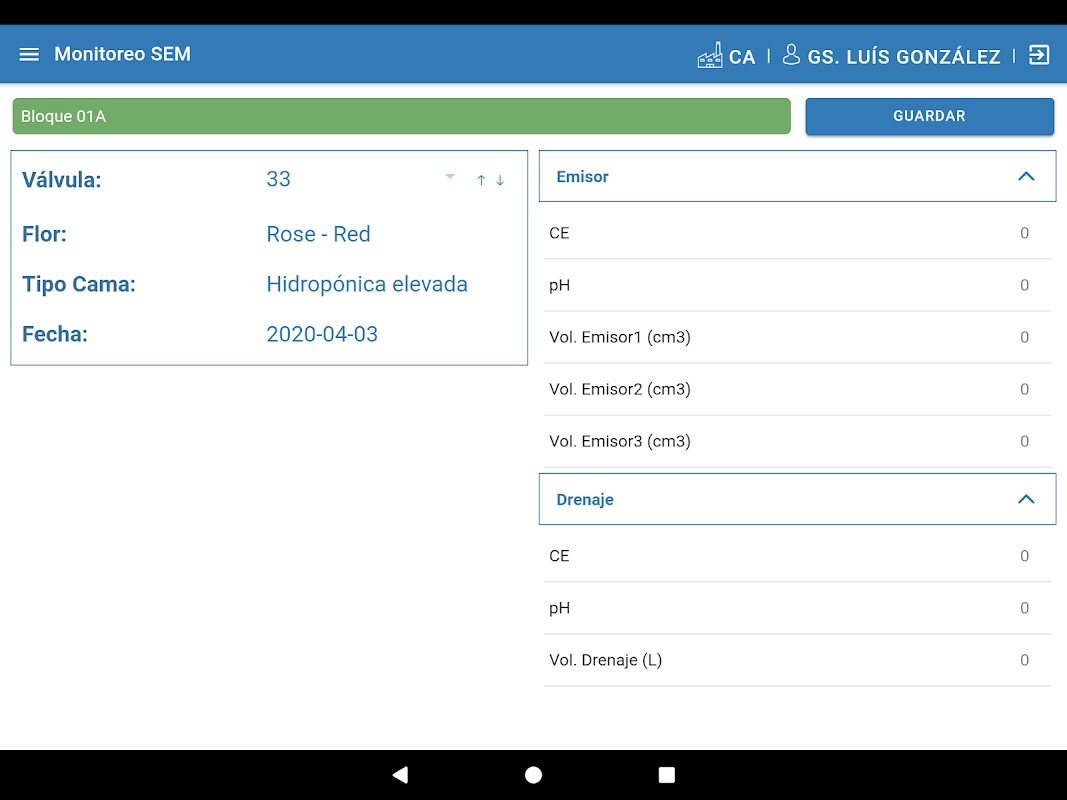 APP SEM. Cuenta con funcionalidades inicialmente de sincronización de información proveniente de planos de siembra, después de realizar el inicio de sesión correspondiente para ingresar a la aplicación, se va a visualizar la información referente a los bloques existentes según la finca, por cada bloque se encuentran las válvulas pertenecientes al bloque. Y de acuerdo con la selección de la válvula, se puede visualizar tipo de flor, tipo de cama y se podrá ingresar la fecha del monitoreo.