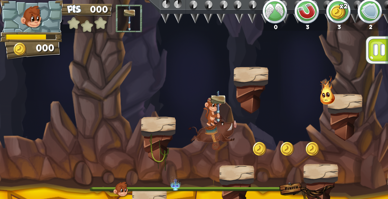 - Verzamel gouden munten en koop verschillende karakters, boze aap, verdrietig, vrolijk, verschillende kleuren