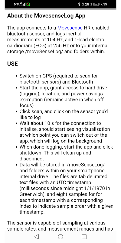The sensor is capable of sampling at various sample rates, and measurement ranges and has many more capabilities. I have included hard coded optional sample rates, which can be modified through a settings page ("move" icon in the taskbar of the app). Selecting "OFF" will disable recording the sensor. Also includes the option to save device-reported heart rate and R-R intervals. My smartphone was unable to record at high sample rates, 208 was the highest that worked for the IMU if I turned off the 1-lead ECG. The default sample rates, and hard coded measurement ranges settings will work to record physical activity based on the inertial signals, and to evaluate heart rate based on the 1-lead ECG.