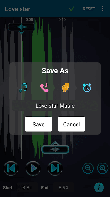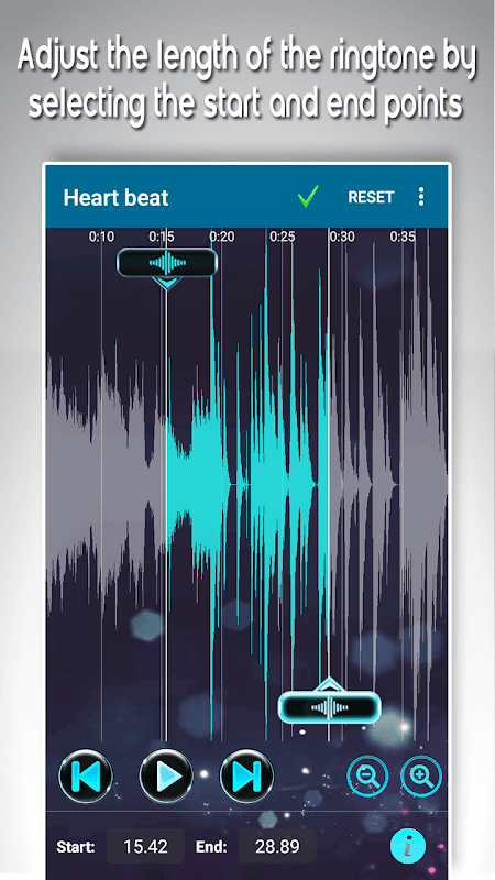 - Stel het begin/eindpunt voor een precieze en perfecte knippertoon aan. Raak de waveform editor aan om de lengte van de beltoon aan te passen door de start en eindpunten te selecteren!