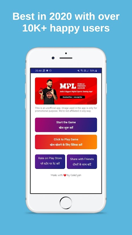 Disclaimer: This is an unofficial MPL game app. This is only a guide app to help you win money. We're not affiliated in any way to MPL or any other brands. This app is only provided for educational, reference and promotional purpose. Images used are only for promotional purpose. To report any illegal/copyright/trademark use of image or resources please contact us at [email protected].