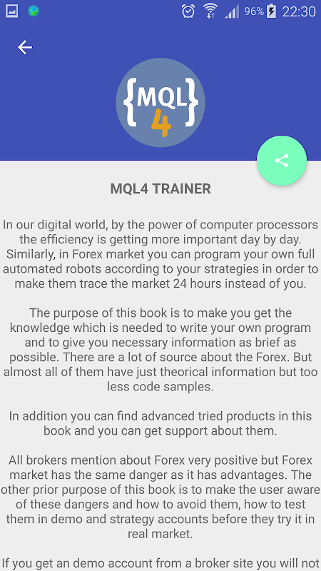 The purpose of this book is to make you get the knowledge which is needed to write your own program and to give you necessary information as brief as possible. There are a lot of source about the Forex. But almost all of them have just theorical information but too less code samples.