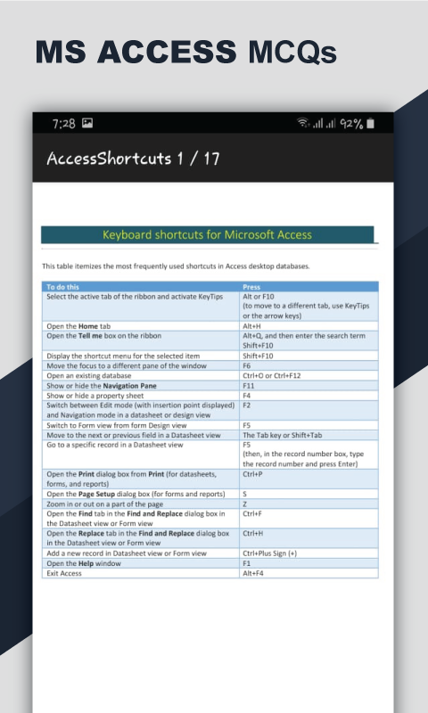 MS Office MCQ's is een offline app voor het leren van MS Word, Excel PPT, ACCESS-sneltoetsen