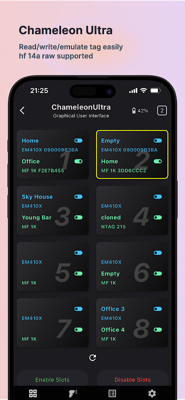 MTools BLE App is een alles-in-één app voor PN532 BLE, PCR532, ChameleonUltra, ChameleonUltra Dev Kit, ChameleonLite en Pixl.js-apparaten. Het ondersteunt het lezen en schrijven van Mifare Classic 1K, Mifare Classic 4K, Mifare Ultralight, Mifare Ultralight C, NTAG203, NTAG213, NTAG215, NTAG216, Mifare Desfire, Mifare Plus en andere NFC-tags met APDU-opdracht.