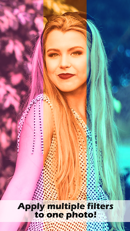 Add cool filters for pictures and effects on pictures from your phone gallery with Multiple Filter Photo, a free app which will allow you to perform professional photo editing on your selfies. Enjoy adding great camera effects, filters for images and create a quick grid on pics to split them into parts and edit each of the parts separately. With this unique photo editing software you can make an extraordinary photo montage and share it on any social network directly from this filter editor and leave your friends speechless. Create a multicolored selfie by applying two or more camera filters and effects at a time, explore the app for pictures and try out all the selfie filters and cute photo frames we've prepared for you. Download Multiple Filter Photo free of charge and let's make some photo art together!