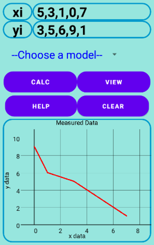 U kunt uw gegevens bekijken door op de knop BEKIJKEN te klikken om het juiste regressiemodel uit de lijst te kiezen en vervolgens op de CALC-knop te klikken om de coëfficiënten van het model en de bepalingscoëfficiënten te vinden