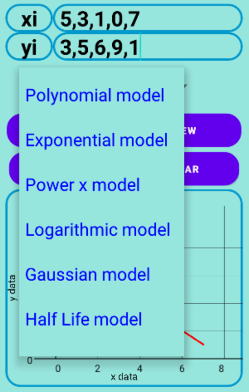 als u uw dataset wilt aanpassen aan de volgende vergelijkingen: Exponentieel, Vermogen, Halfwaardetijd, Michaelis Mentent (plateau) en Gauss-curves: u moet de app voorzien van x- en y-dataset en vervolgens op de overeenkomstige knop klikken (voor Vermogenscurve druk op de Power fit-knop) (lineaire regressiegrafiek, niet-lineaire regressie, meervoudige lineaire regressie, polynomiale regressie, kwadratische regressiecalculator, regresión y correlacion lineal, )