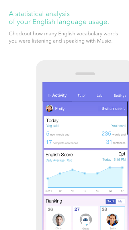 -Engels Score: Het zet het gesprek gegevens van u en Musio in een eenvoudige grafiek.