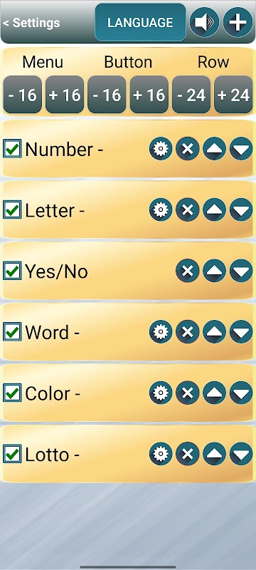 In de instellingen onder het woord "Menu" zijn er twee knoppen om de lettergrootte voor alle koppen te wijzigen. Onder het woord "key" zijn er ook twee toetsen om de lettergrootte voor alle toetsen te wijzigen en onder het woord "line" zijn er ook twee toetsen om de lettergrootte voor alle onderstaande regels te wijzigen.