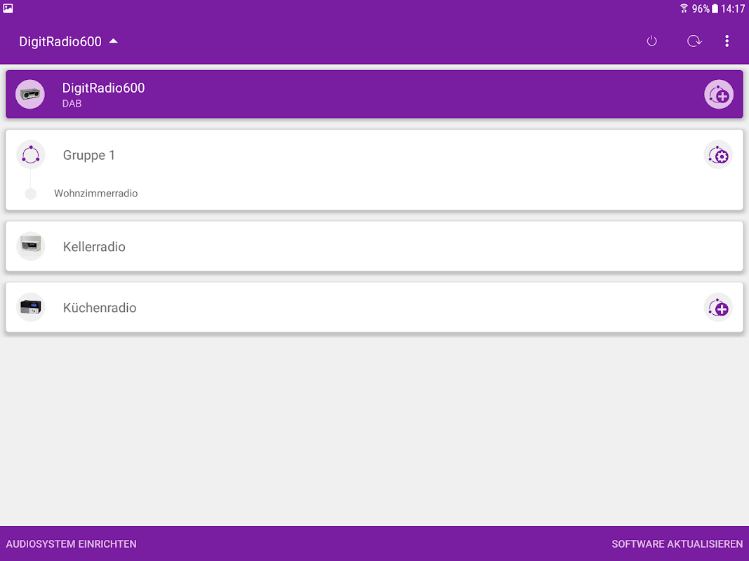 Mit Hilfe der MyDigitRadio Pro App können Sie mehrere vorhandene DigitRadios zu einer Multiroom-Zone zusammenfügen und Ihre Musik überall im Haus synchron abspielen. Eine aktuelle Übersicht sowie nähere Informationen zu Multiroom kompatiblen TechniSat Geräten finden Sie unter https://www.technisat.com/de_DE/MyDigitRadio-Pro/352-707/