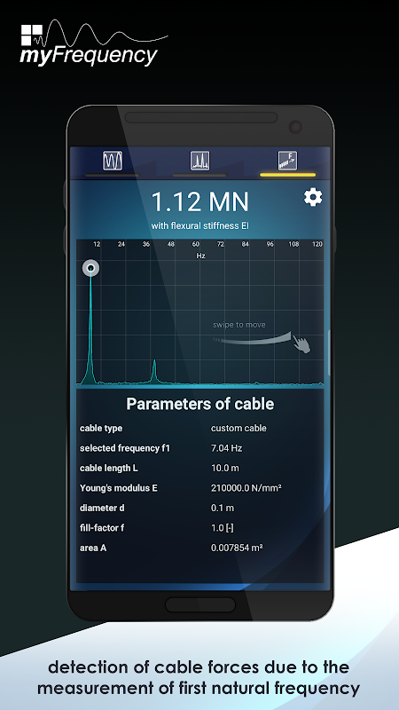 Je kunt deze gebruiksvriendelijke en machtige app gebruiken als een accelerometer om trillingen / oscillatie, natuurlijke frequenties / eigenfrequenties en dempingswaarden van objecten, machines en structuren te detecteren. Verder kun je kabelkrachten van kabelachtige elementen zoals hangers van bruggen detecteren. De spankracht / voorgespannen kracht van een touw of draad zal worden berekend als gevolg van de eerste natuurlijke frequentie van de kabel.