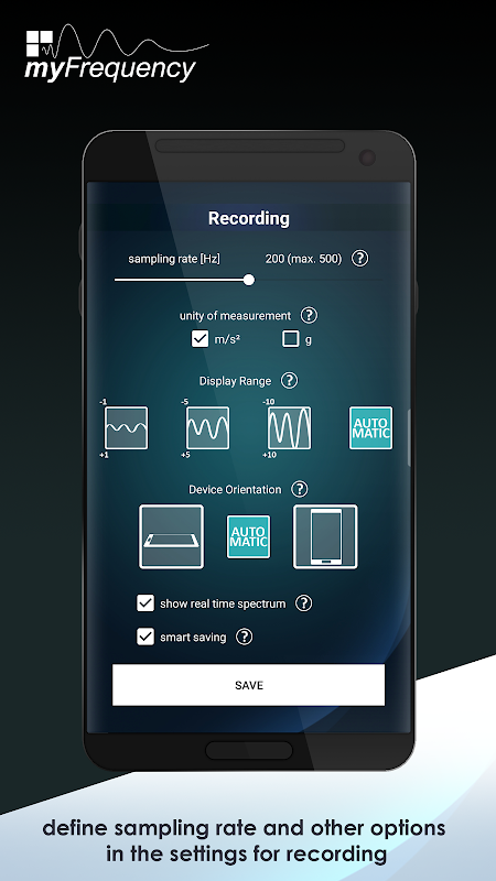 De versnellingssensor registreert de trilling in alle drie de assen en slaat de signalen op in een tekstbestand op het apparaat voor directe analyse op de smartphone of voor daaropvolgende verwerking op de computer. De gegevens kunnen worden overgedragen via een USB-kabel of rechtstreeks in de app met een e-mail naar de computer.
