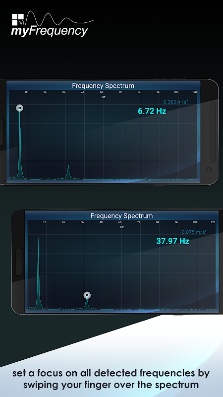 Naast de frequentie met de maximale versnellingsamplitude kunnen alle andere aangeslagen frequenties afzonderlijk worden geselecteerd door met uw vinger over een gedetailleerd beeld van het spectrum te vegen.
