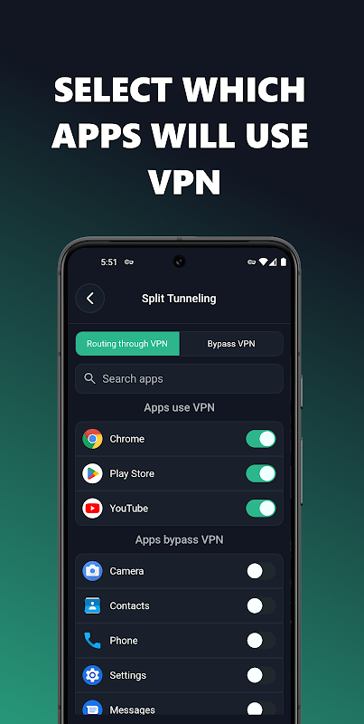 - App-gebaseerde routing – kies welke apps VPN-tunneling gebruiken en welke direct verbinding maken voor maximale flexibiliteit (perfect voor bankieren, voicechat of lokale apparaten).