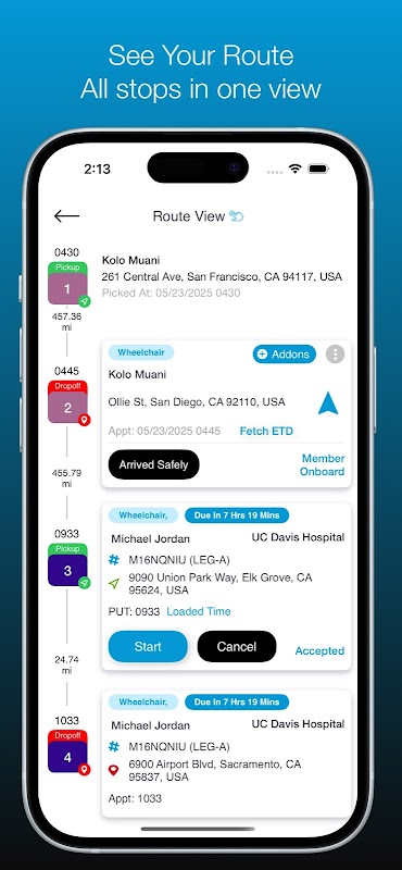 Vergroot de betrouwbaarheid en flexibiliteit van uw NEMT-service. Met actuele informatie over de toewijzing van ritten en operationele updates van het centrale dispatchingsysteem kunt u gedetailleerde informatie bekijken, inclusief speciale behoeften van patiënten, allemaal op het gemak van uw mobiele apparaat.