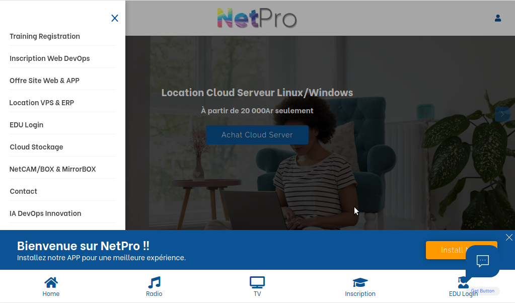 Services et Formation E-Learning en tant que hébergeur cPanel Web ERP SSD illimités, Cloud Server Linux & Windows, conception VPN-Site Web-APP mobile, Broadcast SSL TV Radio, 3D Vidéo PUB. Tech TRACEUR GPS, NetBOX Smart routeur avancé; NetCAM caméra surveillance intelligente pour détection intrus: sauvegarde auto Cloud-alarme Appel & SMS illimités des Polices plus proches + Pointage Reconnaissance Faciale & QR2D; MirrorBOX contrôle votre maison par la voix!