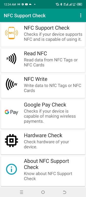 Met NFC Support Check kunt u snel en eenvoudig bepalen of uw telefoon NFC (Near Field Communication) ondersteunt en of deze compatibel is met Google Pay (G Pay). Met deze eenvoudige en lichtgewicht app kunt u met slechts een paar tikken de NFC-lezer van uw telefoon testen en de functionaliteit van Google Pay verifiëren.
