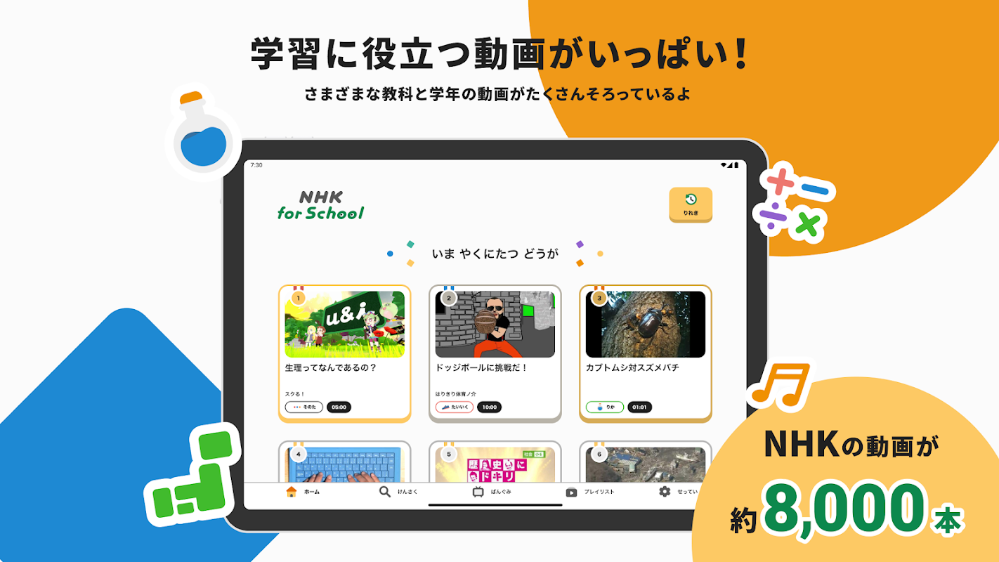 Bekijk eenvoudig educatieve video's van NHK voor diverse vakken en leerjaren, waaronder Japans, wiskunde, natuurwetenschappen, maatschappijleer, Engels, lichamelijke opvoeding, muziek en kunst,