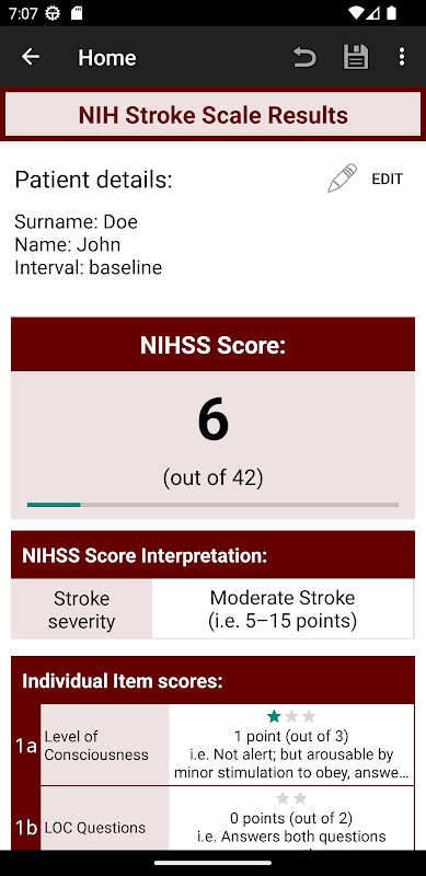 NIHSS-, mNIHSS-, sNIHSS-8- en sNIHSS-5-scores beoordelen, berekenen, opslaan en exporteren.