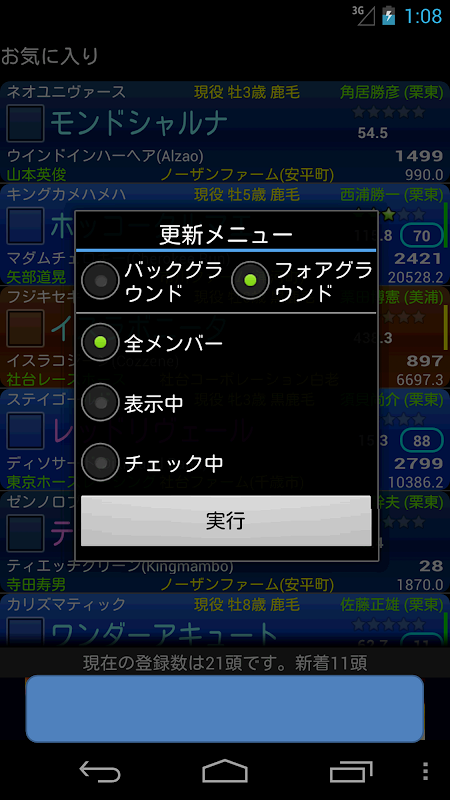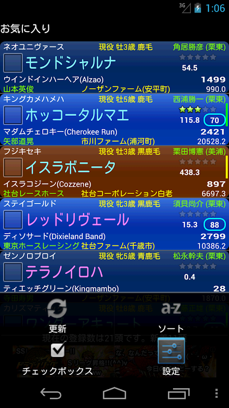 リストに登録した馬の掲示板更新数をHPにアクセスすることなく知ることができます。また2ch風の勢いが表示されるので、注目馬以外でもどんな馬が注目されているか、すぐさま知ることができます。