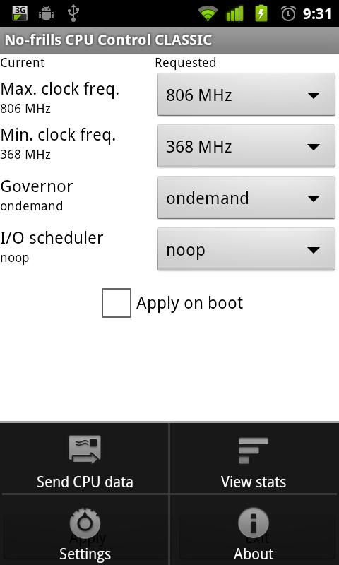 No-frills CPU Control CLASSIC is a trimmed down version of the popular No-frills CPU Control. It is meant for older devices running Android 1.6 "Donut" or Android 2.0 "Eclair" or for people who want an app as small as possible: just around 400KB!