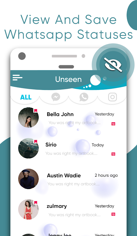 Verberg nu het laatst gezien met ‘No Last Seen & View Deleted Messages - Unseen App’ op WhatsApp. Lees het bericht zonder blauwe vink zonder iemand te laten zien dat u het bericht leest met deze ongeziene gratis app. Als iemand een bericht op WhatsApp verzendt en het verwijdert, kun je het bericht nog steeds gratis lezen in deze ‘No Last Seen View Deleted Messages - Unseen App’. Verberg uw WhatsApp online status en blauwe vinkjes met herstel van alle berichten in deze gratis ongeziene app. Lees het bericht met deze Unseen Messenger op je mobiele telefoon.
