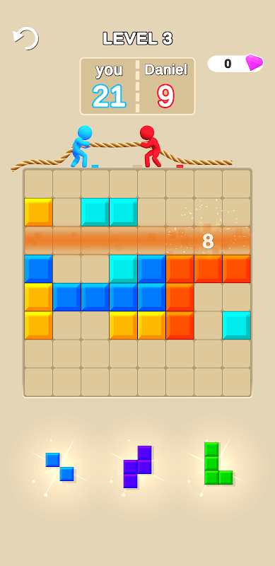 Vul een rij met blokken en verhoog je energie en soldaten om het touwtrekken te winnen
