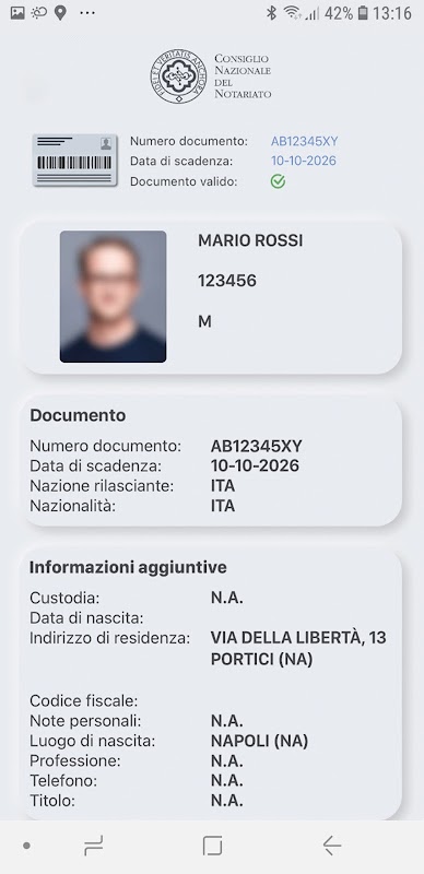 Met NotaryID kunt u in volledige autonomie de persoonlijke gegevens rechtstreeks uit de elektronische identiteitskaart (CIE) of uit het elektronische paspoort (PE) halen. Door het document te scannen - met behulp van de camera en de NFC-lezer van de smartphone - kan de app de persoonlijke gegevens in de CIE en PE opvragen en naar de notaris sturen die ze opvraagt voor het wettelijk toegestane gebruik.