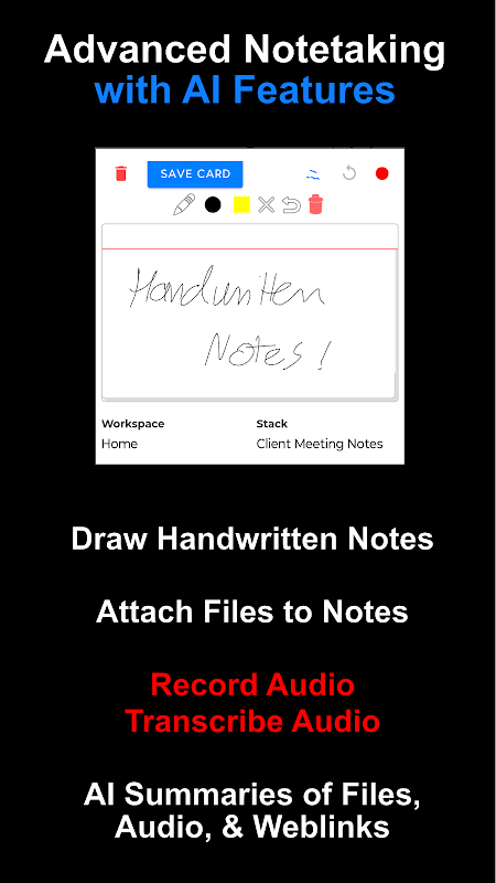 - While recording you can save a note card and keep recording - ideal for capturing notes during a meeting or lecture.