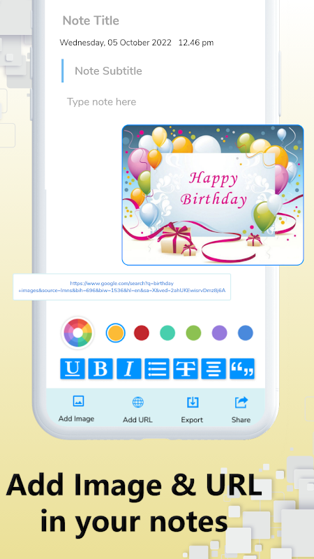 De Kladblok-app - Sticky Notes is een eenvoudige, gemakkelijke en gratis app voor het maken van notities die helpt bij het maken van aantekeningen, notitieboekjes en takenlijsten. De Note Pad - Notepad-app bevat de betoverende gebruikersinterface die de gebruiker helpt bij het gebruik van de app. Bovendien zijn er verschillende opmaakfuncties beschikbaar in Sticky Notes - Notes Making-app zoals vet, cursief, aanhalingstekens, hyperlink, doorhalen, opsommingsteken en opmaak duidelijk. U kunt elke kleur toepassen op notities. Er is geen limiet aan het toevoegen van tekst door dit notitieblok of de Quick Notepad - Simple Note-app te gebruiken, dus maak een plaknotitie of takenlijst naar wens met de Simple Note - Notepad-app. Bovendien kunt u afbeeldingen in notities plaatsen en ze exporteren als afbeelding of in tekstformaat.