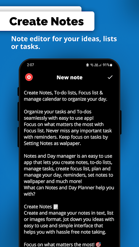 Maak notities, takenlijsten, focuslijsten en beheer de agenda om uw dag te organiseren.🏁🌞