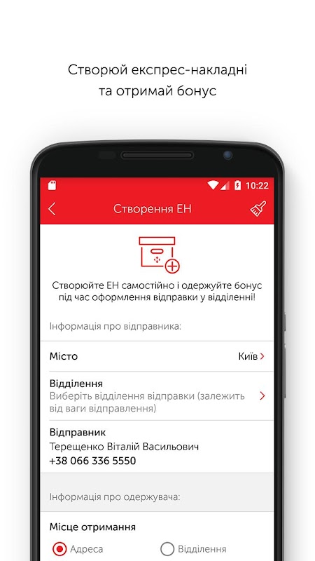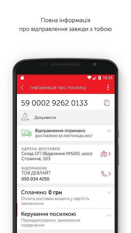 Beheer uw levering, volg het pad van het pakket, bestel en betaal voor Nova Poshta-zendingen via de mobiele applicatie. Bespaar tijd in filialen.