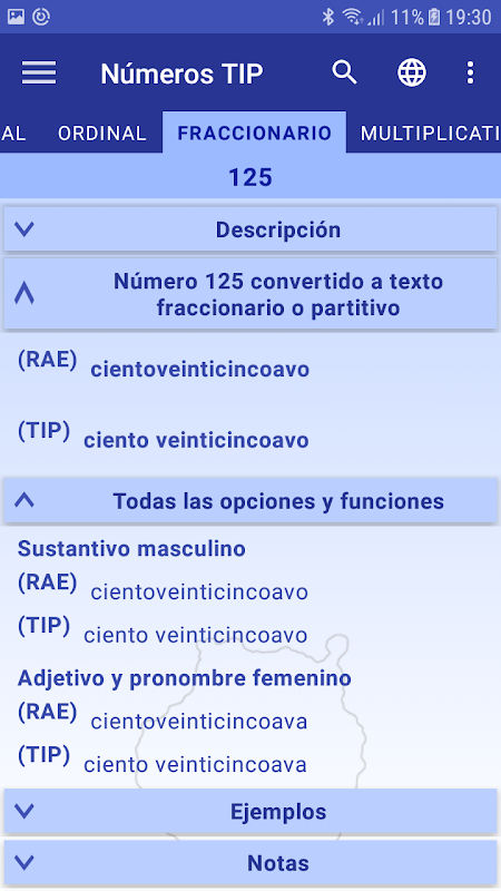 Números TIP realiza la conversión de un número a letras, a texto cardinal, ordinal, fraccionario o partitivo, multiplicativo, romano, conjuntos, colectivos, polígonos, poliedros y edades, y ofrece información morfológica, ortográfica y gramatical de cada uno de los términos. Además, se incluyen ejemplos que ayudan a la comprensión y buen uso.