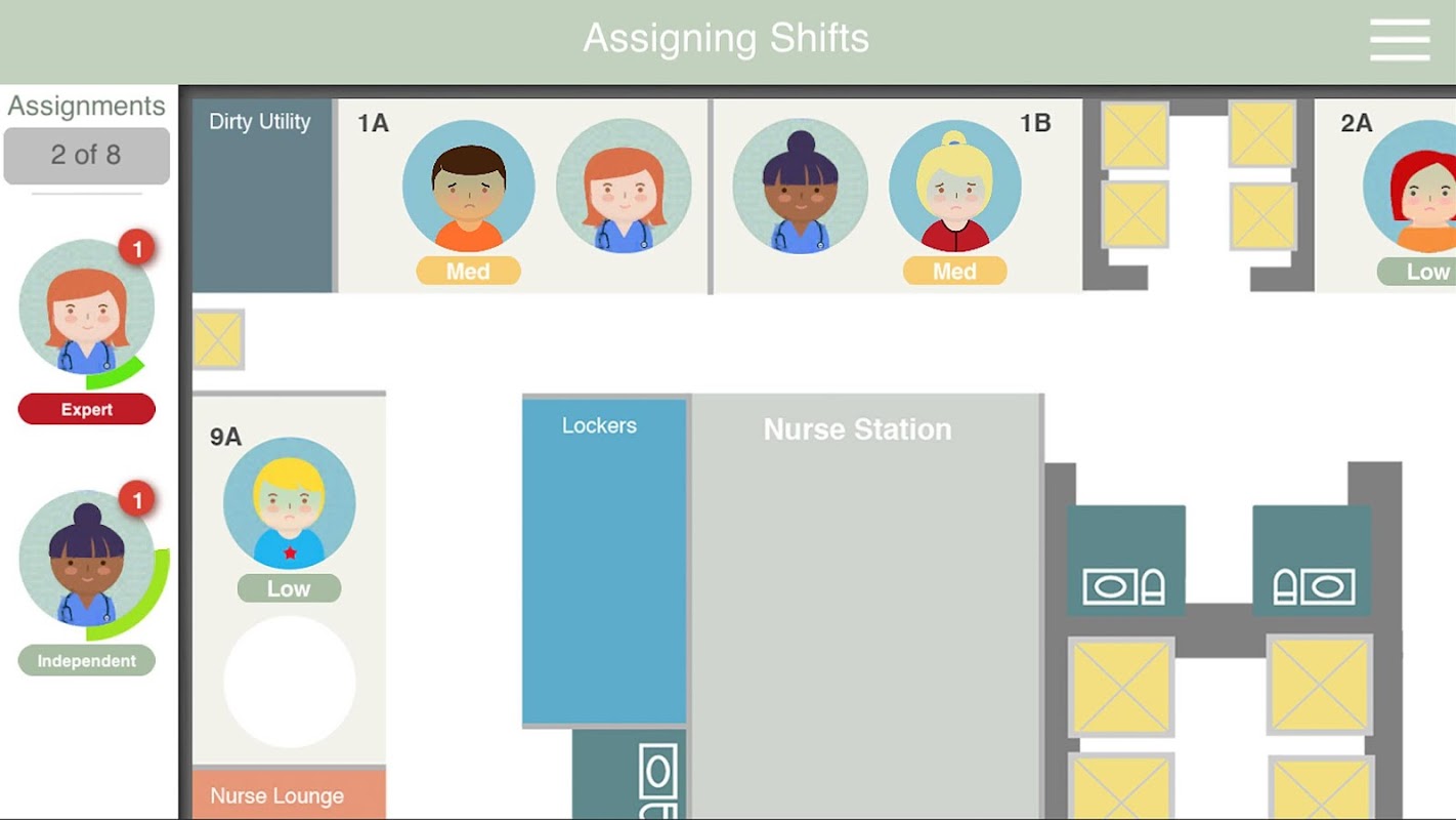 Een mobiele game te helpen studenten verpleegkunde oefenen de multifactor besluitvormingsproces van de verpleegkundige opdracht, waaronder nauwkeurig herkennen verpleegkundige competentie, beoordelende patiënt scherpte, en het bepalen van hoe billijk te wijzen welke patiënten elke verpleegkundige ziet op een verschuiving. Hoewel deze vaardigheden traditioneel moeilijk om te leren, zonder dat op de baan in een hoog-risico-omgeving zijn geweest, deze nieuwe praktijk tool maakt het mogelijk studenten om veilig te falen, zonder dat dit invloed gezondheid van de patiënt.