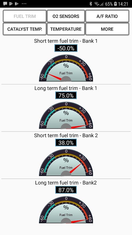 * Toont de motorstatus wanneer de app is verbonden met de Bluetooth-adapter (op de datalinkpoort van de auto). Als de auto een foutcode heeft, verandert de kleur van de motorstatusindicator periodiek van groen naar rood en vice versa.