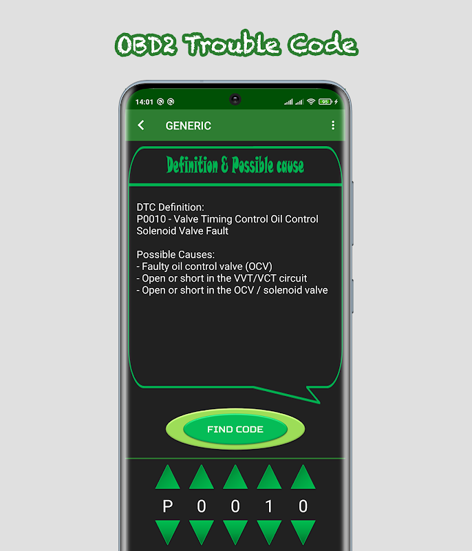 * Selecteer voertuig -> Selecteer code -> Druk op zoekknop -> Zie definitie en mogelijke oorzaken.