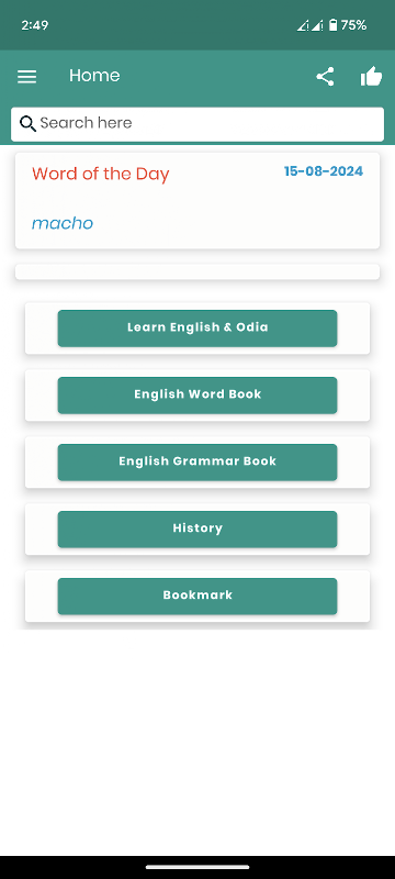 U kunt woorden zoeken in de Engelse taal of de Odia-taal gebruiken met een prachtig ontworpen gebruikersinterface en betekenis krijgen in Odia, Engels en Hindi. Engelse woorden kunnen ook worden doorzocht met spraak-naar-tekstfuncties die in de app zijn geïmplementeerd.