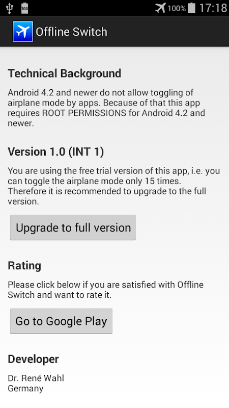 Schakelen vliegtuig modus door apps is meestal niet toegestaan / ondersteund door Android 4.2 en nieuwer. Daarom is deze app vereist root-permissies voor Android 4.2 en hoger! Als je niet weet wat dit betekent, dan kunt u deze app niet installeren!