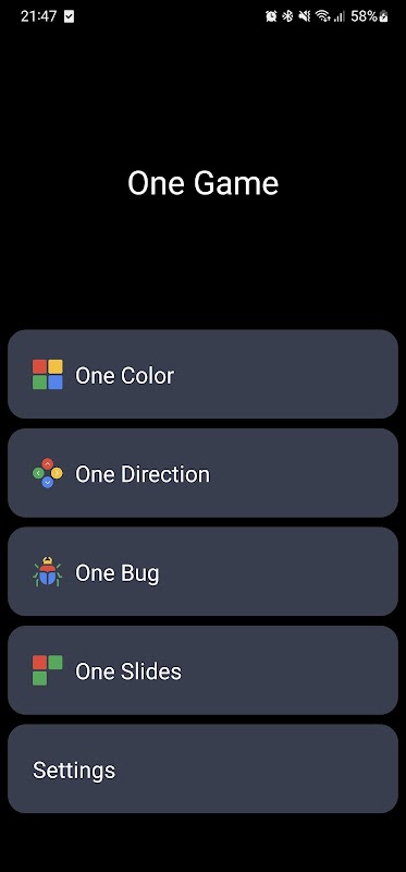 - Vier spellen: "One Color", "One Direction", "One Bug" en "On Slides".