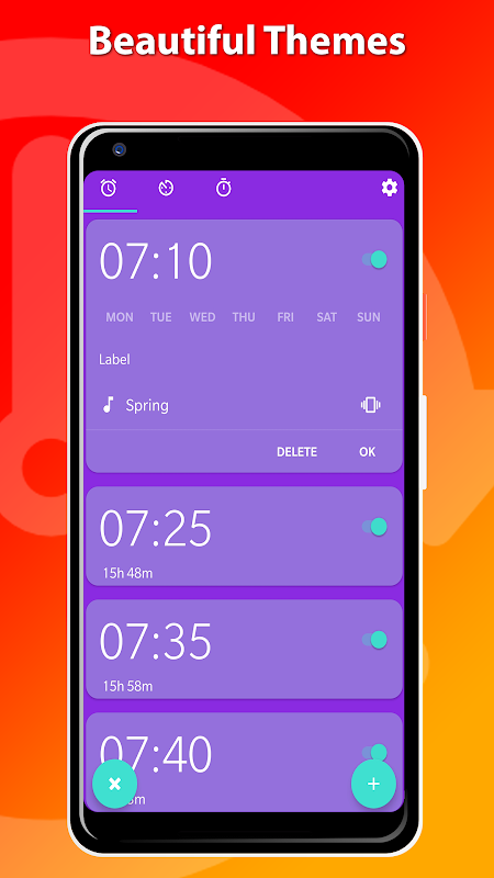 With OneClock you can set up to 8 alarms at once. You can change the number of alarms and time difference between alarms in the settings menu. It's also possible to add just one alarm.