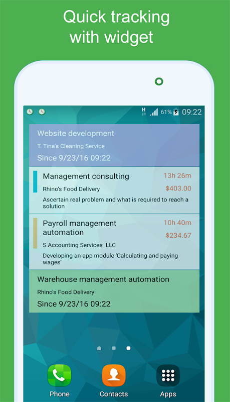 U kunt uurtarieven voor werken instellen om de voortgang van uw projecten bij te houden. Widget op het startscherm toont u het geschatte inkomsten van een project voor altijd.