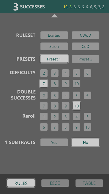 • Scion, Verhevene, Classic World of Darkness, en Chronicles of Darkness rollende regel presets