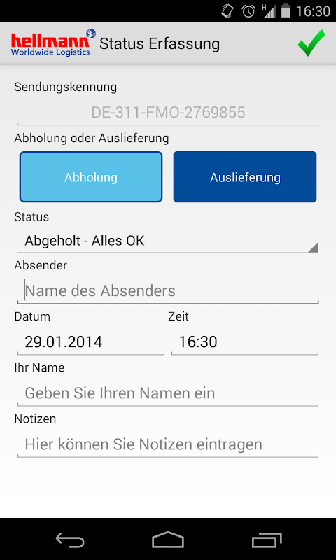De app is alleen beschikbaar in combinatie met een officiële Hellmann Abholungs of uitlevering papier. De barcode op het document wordt gescand met de app, kan dan snel worden ingesteld en gemakkelijk de status voor elke zending.